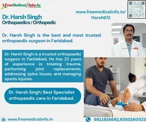 He is the Senior Consultant for Orthopaedics at Batra Heart & Multispeciality Hospital right now, and he also runs Dr. Harsh's Orthopaedic & Spine Wellness. His consultation Hospital is in Block F, Spring Field Colony, Sector 31, Faridabad. The charge for a consultation is ₹500, which includes specialised and value-driven care.