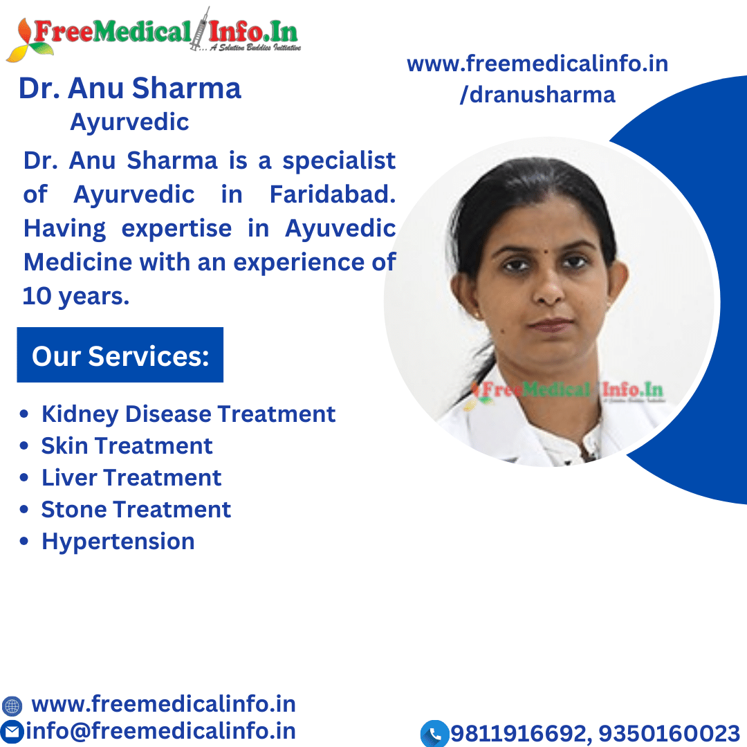 Dr. Anu Sharma, a seasoned Ayurvedic specialist in Faridabad, has a decade of Ayurvedic medicine experience. She has a wealth of knowledge to handle varied health conditions with a personalised and holistic approach, and she offers consultations for an inexpensive charge of 700 INR. With Dr. Anu Sharma's dedication to Ayurvedic therapy in Faridabad, you can embrace well-being. Faridabad's best Ayurveda doctor.