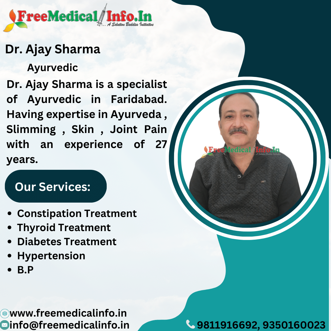 Dr. Ajay Sharma is a recognised Ayurvedic specialist in Faridabad with 25 years of vast experience who can assist you in your recovery.Dr. Sharma Consultation Fees 300INR. Dr. Sharma is a bright example of wellbeing, with an emphasis on skin, joint discomfort, and Ayurveda. isit her at 1/D, 25 Market No. 1, NIT Faridabad. Best ayurvedic skin doctor in faridabad.