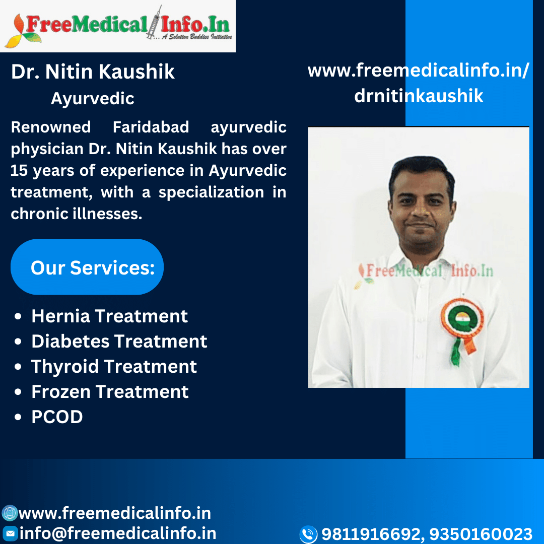 Dr. Nitin Kaushik, a well-known ayurvedic doctor in Faridabad, specialises in chronic illness treatment and has over 15 years of experience in the field. His dedication to holistic healing has earned him a reputation in the profession. Dr. Kaushik treats his patients with excellent, personalised Ayurvedic therapies from his own clinic, Shri Ayurveda Clinic, which is located in Sector 9, 9/10 Dividing Road, Faridabad.Dr. Kaushik's consultation price of 300 INR makes him accessible to everyone.