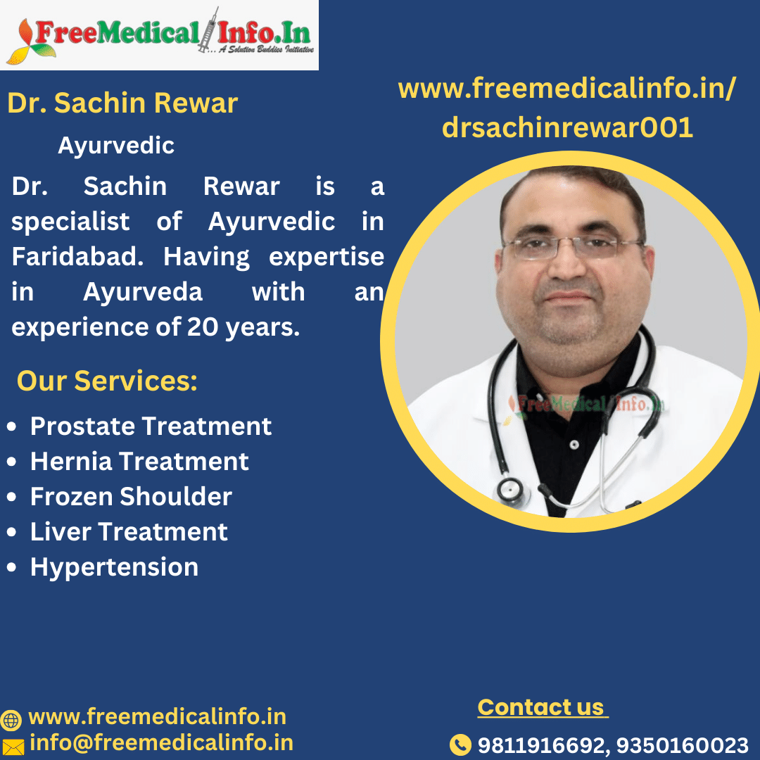 Dr. Sachin Rewar, an experienced Ayurvedic physician, has 20 years of exceptional expertise in Faridabad. His practice, which is conveniently located at Plot No. 1, near Sai Dham Mandir, Tigaon Road, Sector 86, Faridabad, offers full Ayurvedic therapy for 500 INR per consultation. Dr. Sachin Rewar's dedicated Ayurvedic clinic may provide you with a wellness approach. Ayurvedic practitioner in Faridabad.
