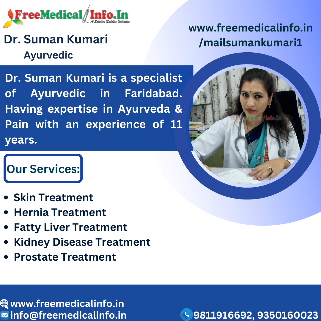 Dr. Suman Kumari is a Faridabad-based Ayurvedic physician with 11 years of experience in Ayurveda and pain management. Her consultations, which provide personalised care, are reasonably priced at 500 INR. Trust in her holistic healing skills as she mixes old wisdom with modern ways to relieve pain and enhance general well-being. In Faridabad, embrace a journey to health with Dr. Suman Kumari's skilled supervision. best ayurveda doctor in Faridabad