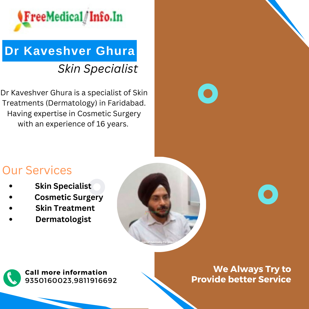 7. Dr. Kaveshver Ghura : Dr.Kaveshver Ghura is a highly skilled dermatologist with over 16 years of experience. He specializes in treating skin conditions like acne, eczema, psoriasis, and vitiligo. He also provides various cosmetic treatments like chemical peels, dermal fillers, and laser treatments.
