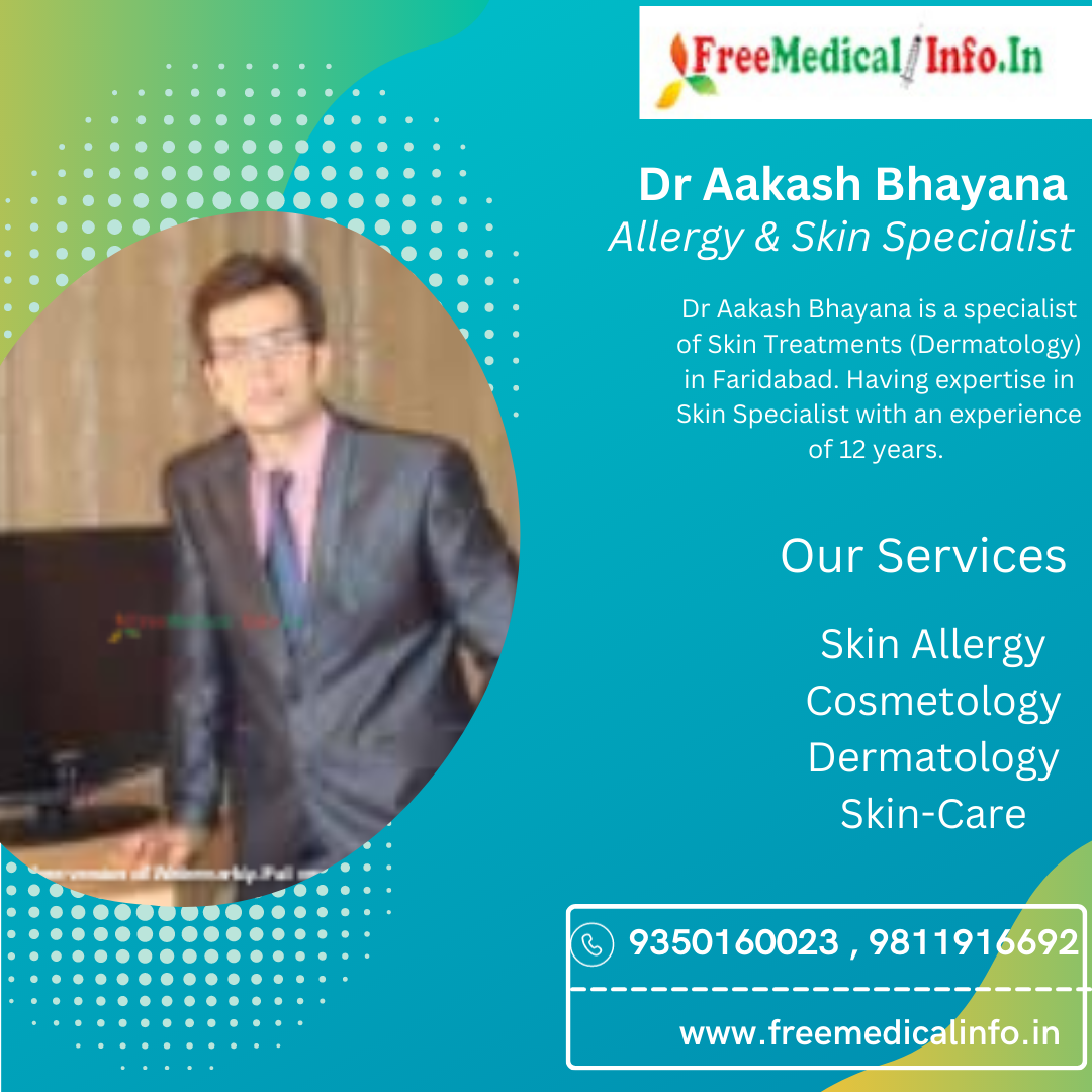 10. Dr Aakash Bhayana: Dr Aakash Bhayana is a specialist of Skin Treatments (Dermatology) in Faridabad. Having expertise in Skin Specialist with an experience of 12 years. Dr Bhayana is currently practicing at Metro Hospital & Bhayana Skin Clinic in Faridabad. Dr Bhayana specializes in treating allergies related to Dermatology, skin allergies, and food allergies. Dr Bhayana is known for his patient-centric approach to treatment and his ability to provide personalized care to each patient.