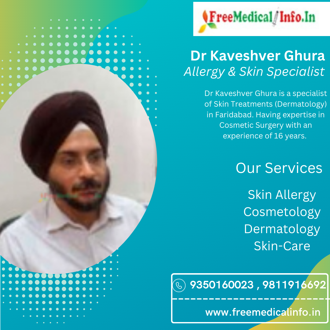 9. Dr Kaveshver Ghura: Dr Kaveshver Ghura is a specialist of Skin Treatments (Dermatology) in Faridabad. Dr Ghura is currently practicing at Metro Hospital & Dr. Kaveshver Singh Clinic in Faridabad. Dr Ghura an Experience 16 Years. Dr Sharma is known for his expertise in treating allergies related to Cosmetic Surgery, skin allergies, and food allergies.