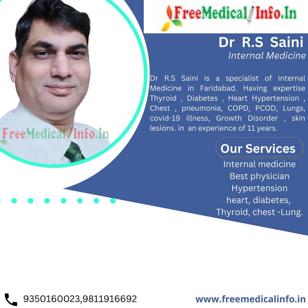 1.Dr R S Saini: - Dr R S Saini is a highly experienced Internal Medicine doctor who has been practicing for over 11 years.Dr. Saini is a consultant in internal medicine at walk in clinic, We Care Multi Speciality Polyclinic, Dr R.S Saini Clinic in Faridabad.Dr Saini:has a special interest in internal Medicine, Best physician ,Thyroid , Diabetes , Heart Hypertension , Chest , pneumonia, COPD, PCOD, Lungs, covid-19 illness, Growth Disorder , skin lesions has helped numerous patients achieve optimal health outcomes.