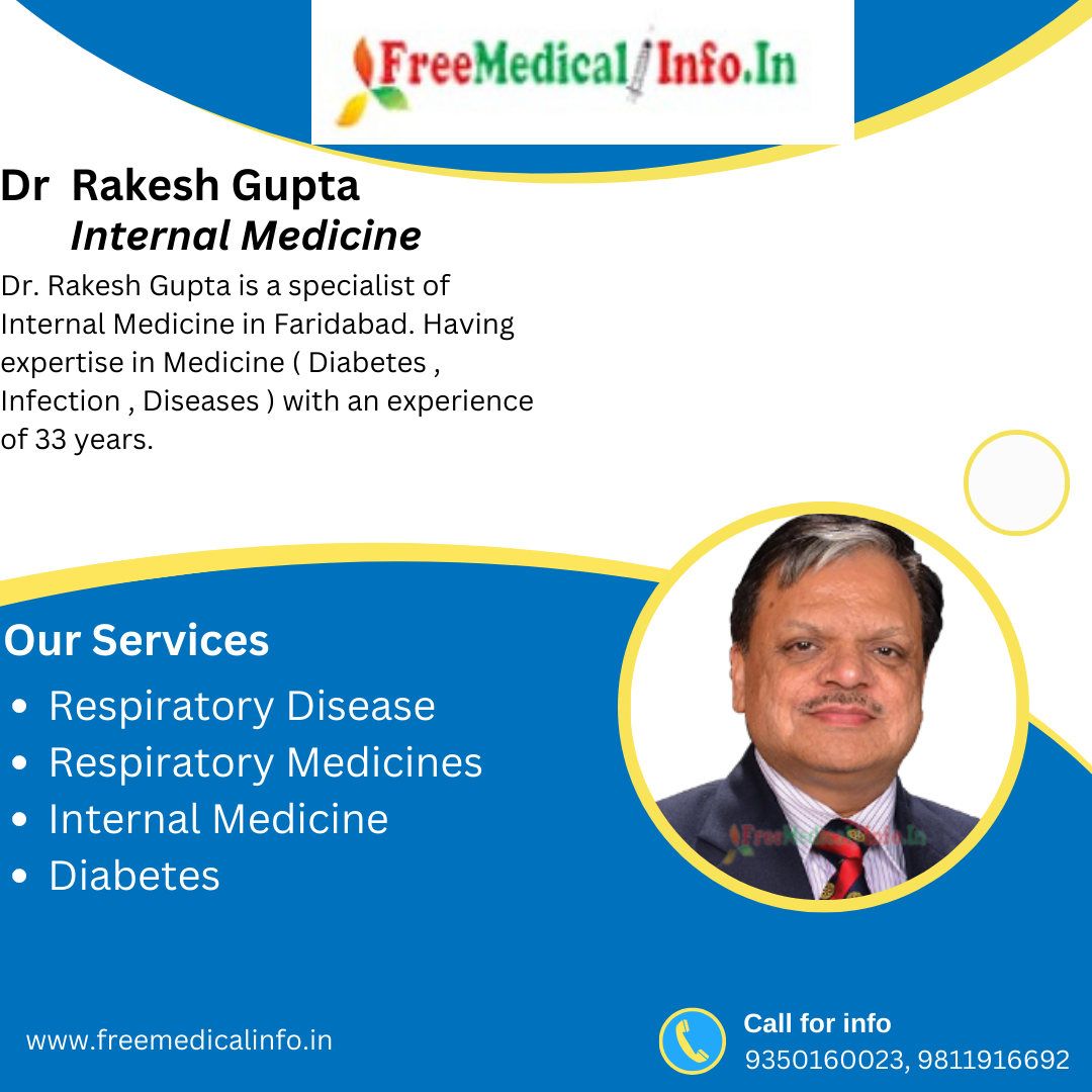 10.Dr. Rakesh Gupta:Dr. Rakesh Guptais a specialist of Internal Medicine in Faridabad.Dr. Gupta is a highly experienced Internal Medicine doctor with over 33 years of experience. Dr Gupta is a consultant in internal medicine at Sarvodaya Hospital in Faridabad. He has a special interest in Diabetes , Infection , Diseases and has helped numerous patients recover from viral and bacterial infections.