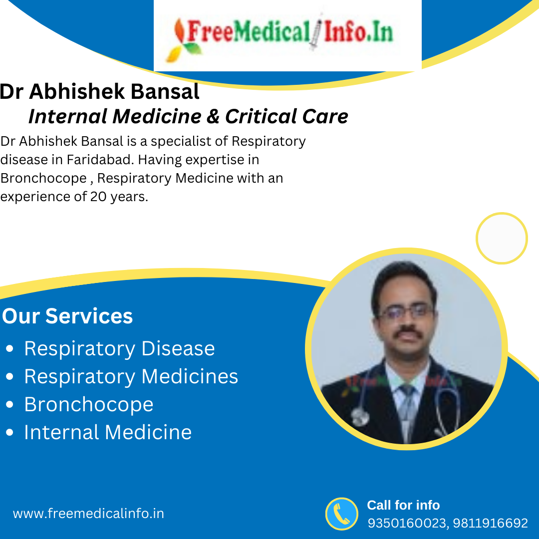2.Dr Abhishek Bansal:Dr Abhishek Bansalis a specialist of Respiratory Disease in Faridabad.Dr. Bansal is a consultant in internal medicine at Metro Hospital in Faridabad. Dr Bansal is a renowned Internal Medicine doctor in Faridabad with over 20 years of experience. He has a special interest in gastroenterology and has helped numerous patients recover from digestive system-related conditions.