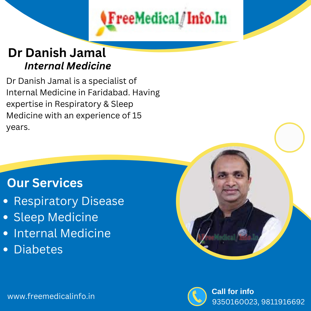 4.Dr Danish Jamal:Dr Danish Jamalis a specialist of Internal Medicine in Faridabad.Dr. Jamal is a highly skilled Internal Medicine doctor who has been practicing for over 15 years. Dr Jamal is a consultant in internal medicine at Shankar Medicare Centre Sector 28 in Faridabad. He has a special interest in Respiratory & Sleep Medicine and has helped numerous patients manage hormonal disorders such as diabetes and thyroid disorders.