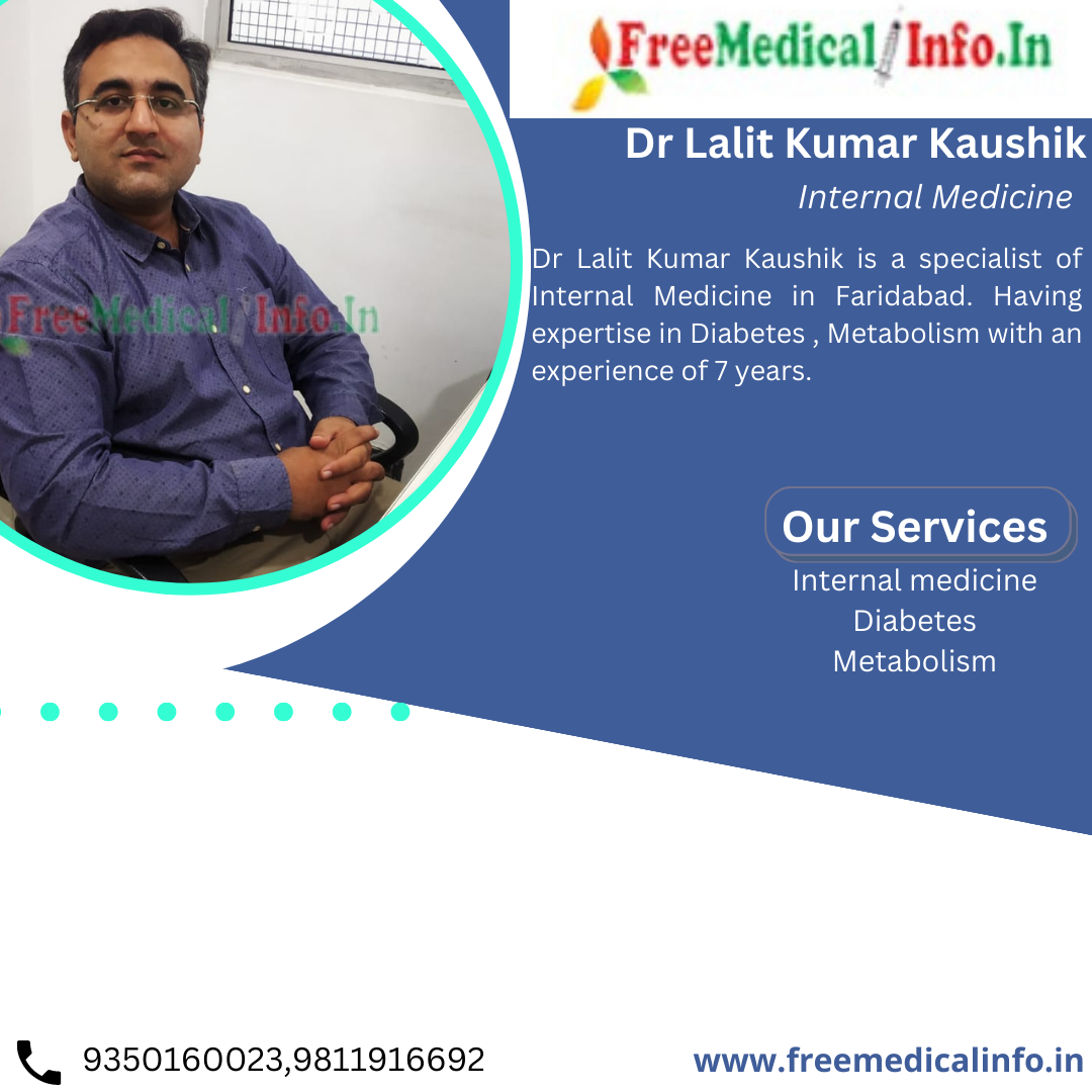 5.Dr Lalit Kumar Kaushik: Dr Lalit Kumar Kaushikis a specialist of Internal Medicine in Faridabad.Dr Kaushik is a consultant in internal medicine at Dr Lalit Kumar Kaushik Health & Diabetes Care Clinic in Faridabad. Dr Kaushik is a dedicated Internal Medicine doctor who has been practicing for over 7 years. She has a special interest in Diabetes , Metabolism infectious diseases and has helped numerous patients recover from viral and bacterial infections