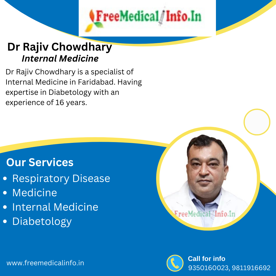 7.Dr Rajiv Chowdhary: Dr Rajiv Chowdharyis a specialist of Internal Medicine in Faridabad.Dr.Chowdhary is a renowned Internal Medicine doctor with over 16 years of experience. Dr Chowdhary is a consultant in internal medicine at SSB Heart And Multispecialty Hospital in Faridabad. He has a special interest in Gastroenterology , Diabetology and has helped numerous patients recover from digestive system-related conditions.