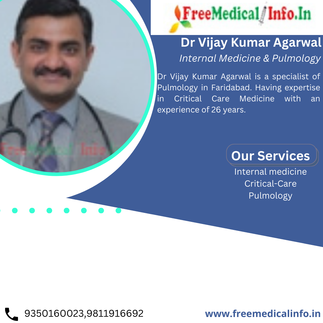 6.Dr Vijay Kumar Agarwal: Dr Dr Vijay Kumar Agarwalis a specialist of Pulmology in Faridabad.Dr Dr Santosh Kumar Aggarwal is a specialist of Internal Medicine in Faridabad. Dr Aggarwal is a consultant in internal medicine at ANSH MEDICARE DOCTORS CLINIC in Faridabad . Dr Agarwal is a highly experienced Internal Medicine doctor with over 26 years of experience. He has a special interest in Diabetology,Pulmology and has helped numerous patients achieve optimal blood pressure levels.