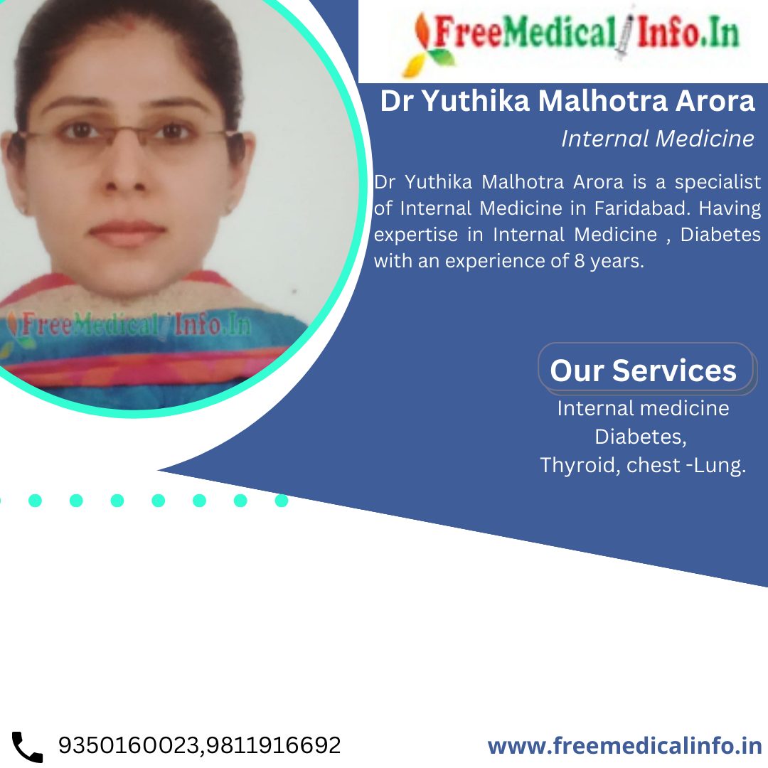 8.Dr Yuthika Malhotra Arora:Dr Yuthika Malhotra Arorais a specialist of Internal Medicine in Faridabad.Having expertise in Internal Medicine , Diabetes with an experience of 8 years. Dr Yuthika Malhotra Arora is a specialist of Internal Medicine in Faridabad. Dr Arora is a highly skilled Internal Medicine doctor with over 8 years of experience. Dr Arora is a consultant in internal medicine at Eye Med Hospital in Faridabad.