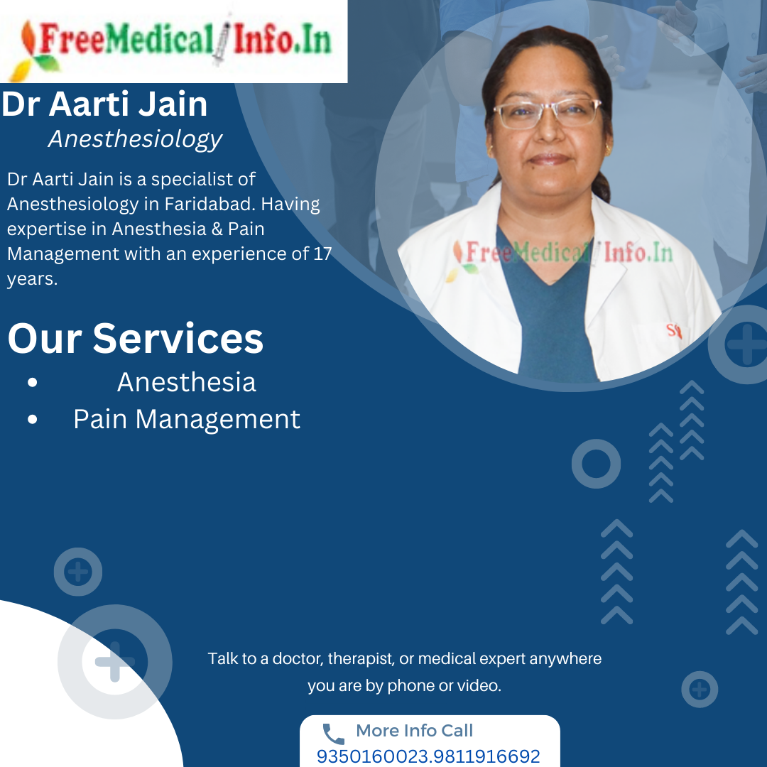 1. Dr Aarti Jain: Dr Aarti Jain is a specialist of Anesthesiology in Faridabad. Dr Aarti Jain is one of the most respected anesthesiologists in Faridabad. Dr Aarti Jain 17 Years of Experience has a keen Anesthesia & Pain Management for detail and a patient-centric approach, making him a favorite among patients and fellow doctors a like.