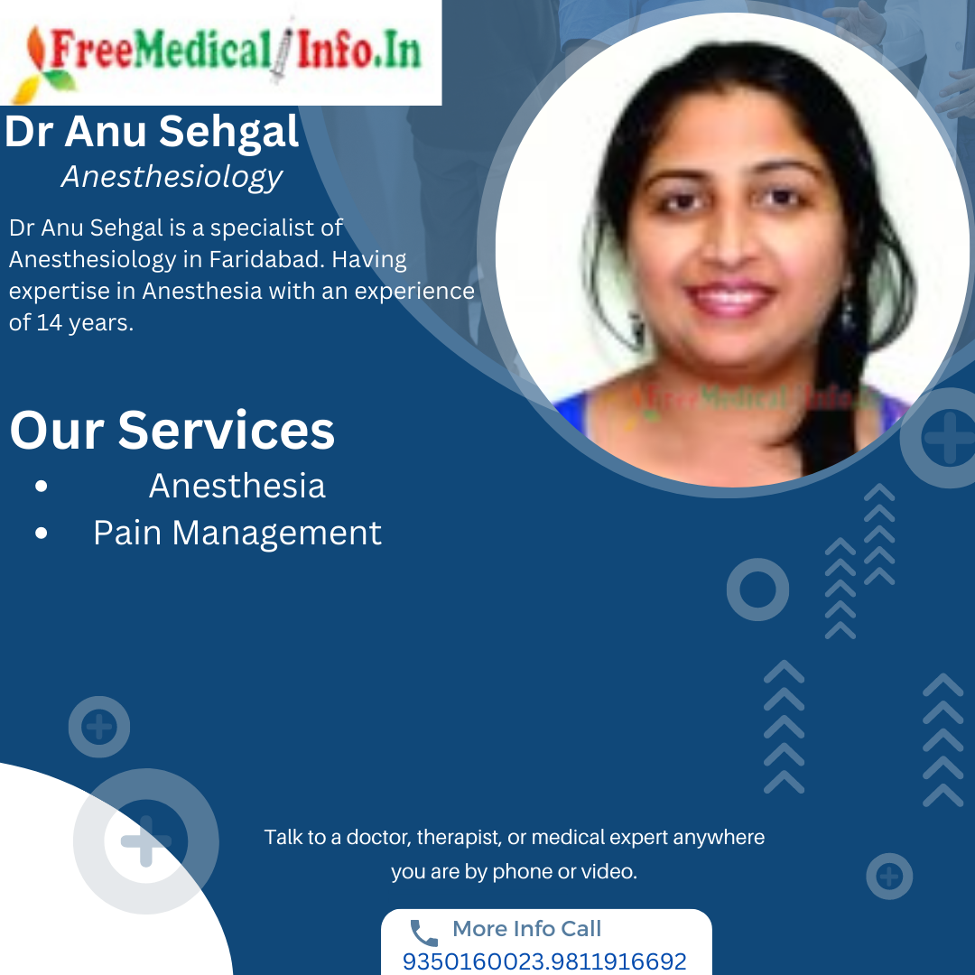 6. Dr Anu Sehgal: Dr Anu Sehgal is a specialist of Anesthesiology in Faridabad.Dr Sehgal is a well-known name in the field of anesthesia, with over 14 years of experience. She is a specialist in obstetric anesthesia and has helped numerous women have safe and comfortable deliveries.