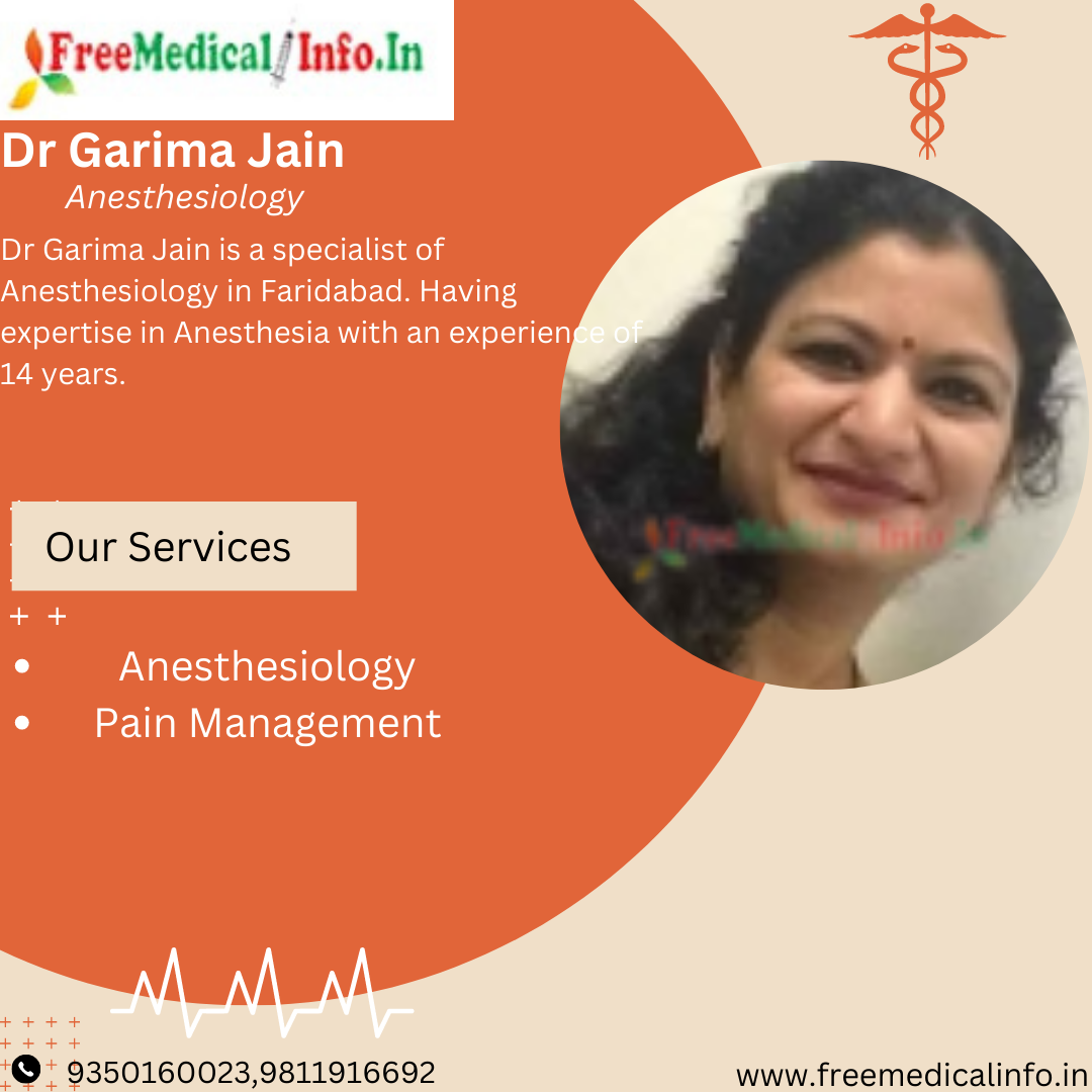 7. Dr Garima Jain: Dr Garima Jain is a specialist of Anesthesiology in Faridabad.Dr. Jain is a highly skilled 14 Years Experience anesthesiologist with a special interest in pediatric anesthesia.