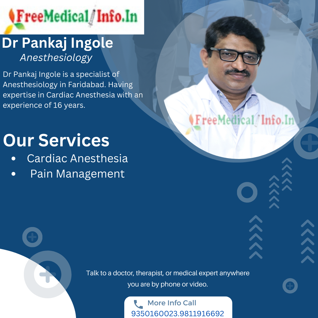 2. Dr Pankaj Ingole: Dr Pankaj Ingole is a specialist of Anesthesiology in Faridabad.Dr. Ingole has a vast experience of 16 years in anesthesia and critical care. Dr Ingole is an expertise of Anesthesia & Pain Management.