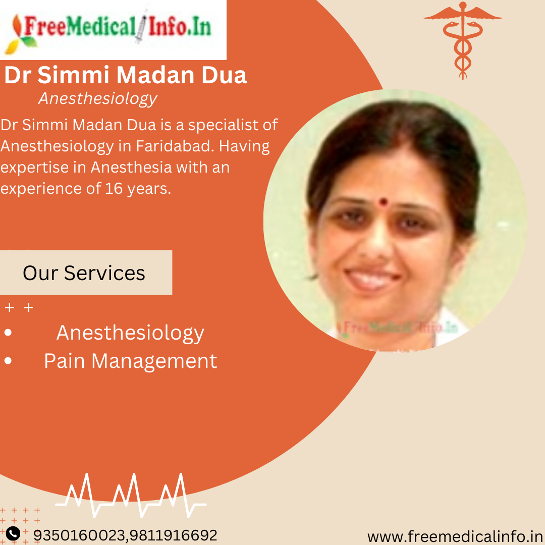 9. Dr Simmi Madan Dua: Dr Simmi Madan Dua is a specialist of Anesthesiology in Faridabad.Dr. Dua is a young and dynamic anesthesiologist with a passion for her work. She has trained in some of the top institutions in the country and has a special interest in pain management.