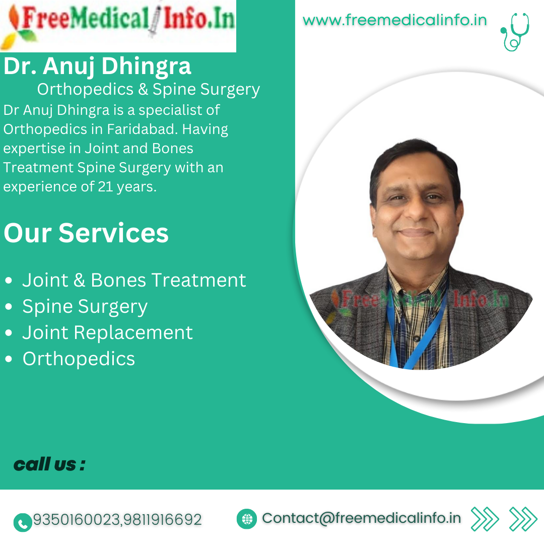 1. Dr. Anuj Dhingra - Dr. Anuj Dhingra is a specialist of Orthopedics in Faridabad.Dr Anuj Dhingra is a renowned orthopedic surgeon with over 21 years of experience. He is the Associated in Sr.Consultation of Vedantaa Hospital in Faridabad. Dr. Dhingra specializes in joint replacement surgery, Spine Surgery, and sports medicine. He has successfully performed thousands of surgeries and is highly respected in the medical community.