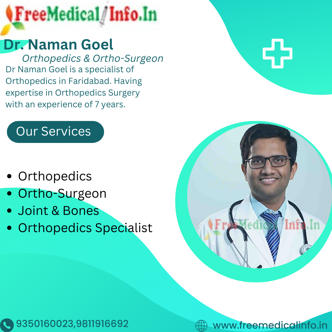6.Dr. Naman Goel - Dr. Naman Goel is a specialist of Orthopedics in Faridabad. Dr Naman Goel is a highly skilled orthopedic surgeon with over 7 years of experience. He is a consultant orthopedic surgeon at Accord Superspeciality Hospital in Faridabad. Dr. Goel specializes in joint replacement surgery, sports medicine. He has a keen interest in research and has published several papers in national and international journals.