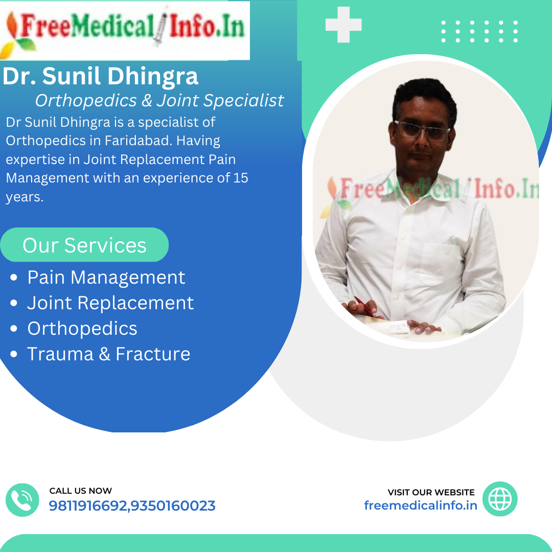 10. Dr. Sunil Dhingra - Dr. Sunil Dhingra is a specialist of Orthopedics in Faridabad. Dr Sunil Dhingra is a well-known orthopedic surgeon with over 12 years of experience. He is a consultant orthopedic surgeon at Healing Hands Orthopedic Clinic in Faridabad. Dr. Dhingra specializes in joint replacement surgery, Pain Management. He is known for his compassionate care and his commitment to patient satisfaction.