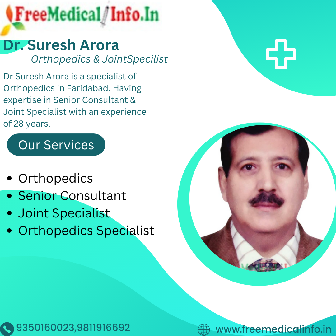 2. Dr. Suresh Arora - Dr.. Suresh Arora is a specialist of Orthopedics in Faridabad.Dr Suresh Arora is a highly skilled orthopedic surgeon with over 28 years of experience. He is a consultant orthopedic surgeon at Surya Ortho & Trauma Centre in Faridabad. Dr. Arora specializes in joint replacement surgery, Joint Specialist, and trauma surgery. He has published several research papers and is a member of several prestigious medical organizations.